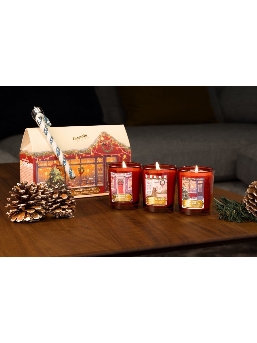 Darčekový set Essentia Vianočná dedinka obsahuje tri romantické vianočné sviečky v elegantných sklenených nádobkách. Každá sviečka je vyrobená z 100 % rastlinného sójového vosku, ručne odlievaná a osadená prírodným bavlneným knôtom.